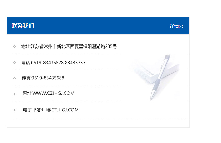 地址:常州市新北區友邦商務大廈1幢16、17層  電話:0519-85101652  傳真:0519-85112595  郵編:213022  網址:www_cz-jiayue_cn.tianyugjg.com  郵箱:xiajifengaa@163.com